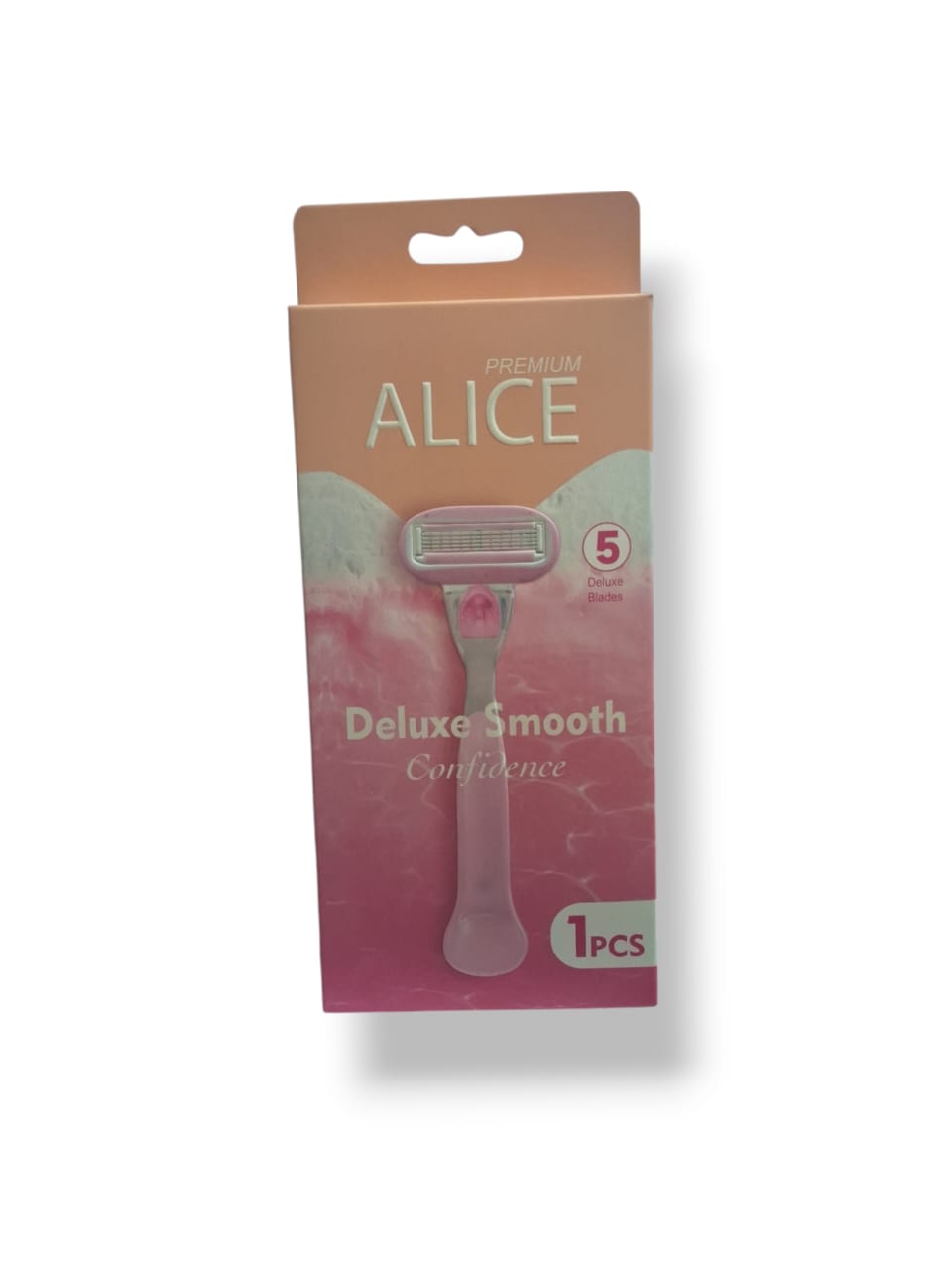 Introducing Alice Premium Deluxe Smooth Confidence 5 Blades - designed for a smooth, confident shave every time. With 5 precision blades, enjoy a close and comfortable shave without irritation. Upgrade your shaving experience with Alice Premium Deluxe.