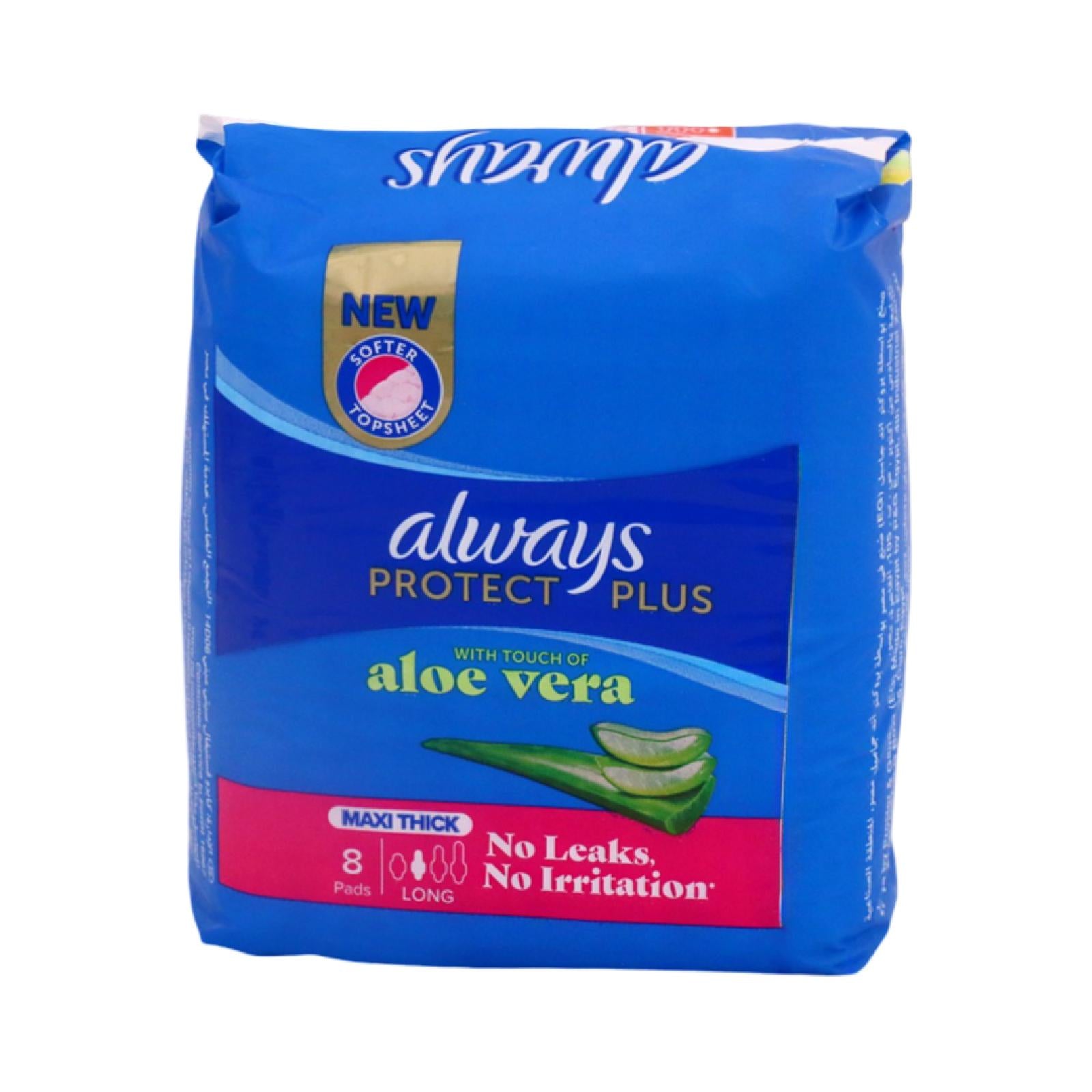 Experience ultimate comfort and protection with ALWAYS PROTECT PLUS WITH ALOE VERA MAXI THICK LONG 8PADS. The added Aloe Vera soothes and nourishes your skin while the maxi thick design provides maximum coverage and absorption. Feel confident and worry-free with this expertly designed product.