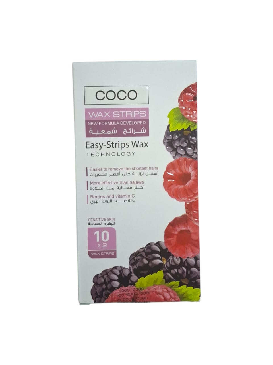 🍓 Smooth and sensitive? Say goodbye to unwanted hair with COCO wax strips infused with berries. Enjoy 10 wax strips for an effortless silky skin without irritation. #NoMoreFuzz #ByeByeStubble 🛍️