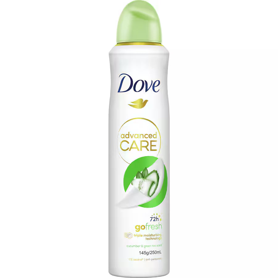 Long-lasting antiperspirant protection, an extra dose of care and a cooling scent – who says you can’t have it all? Feel refreshed and zen whenever you please thanks to Dove Advanced Care Go Fresh Cucumber & Green Tea Antiperspirant Deodorant Aerosol. Dove advanced Care is our most caring antiperspirant range, enhanced with revolutionary triple moisturising technology, for soft and smooth underarm skin even after shaving. This deodorant spray helps boost your skin’s moisture barrier with care and reduce underarm irritation caused by shaving. With refreshingly crisp cucumber and green tea notes, this antiperspirant deodorant is your instant pick-me-up.