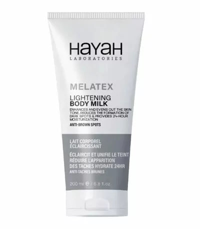 🔆 Achieve brighter and more even skin tone with HAYAH MELATEX LIGHTENING BODY MILK 200ML. This lightweight milk nourishes and hydrates while reducing dark spots and hyperpigmentation. Enjoy a luminous and youthful glow with every use.