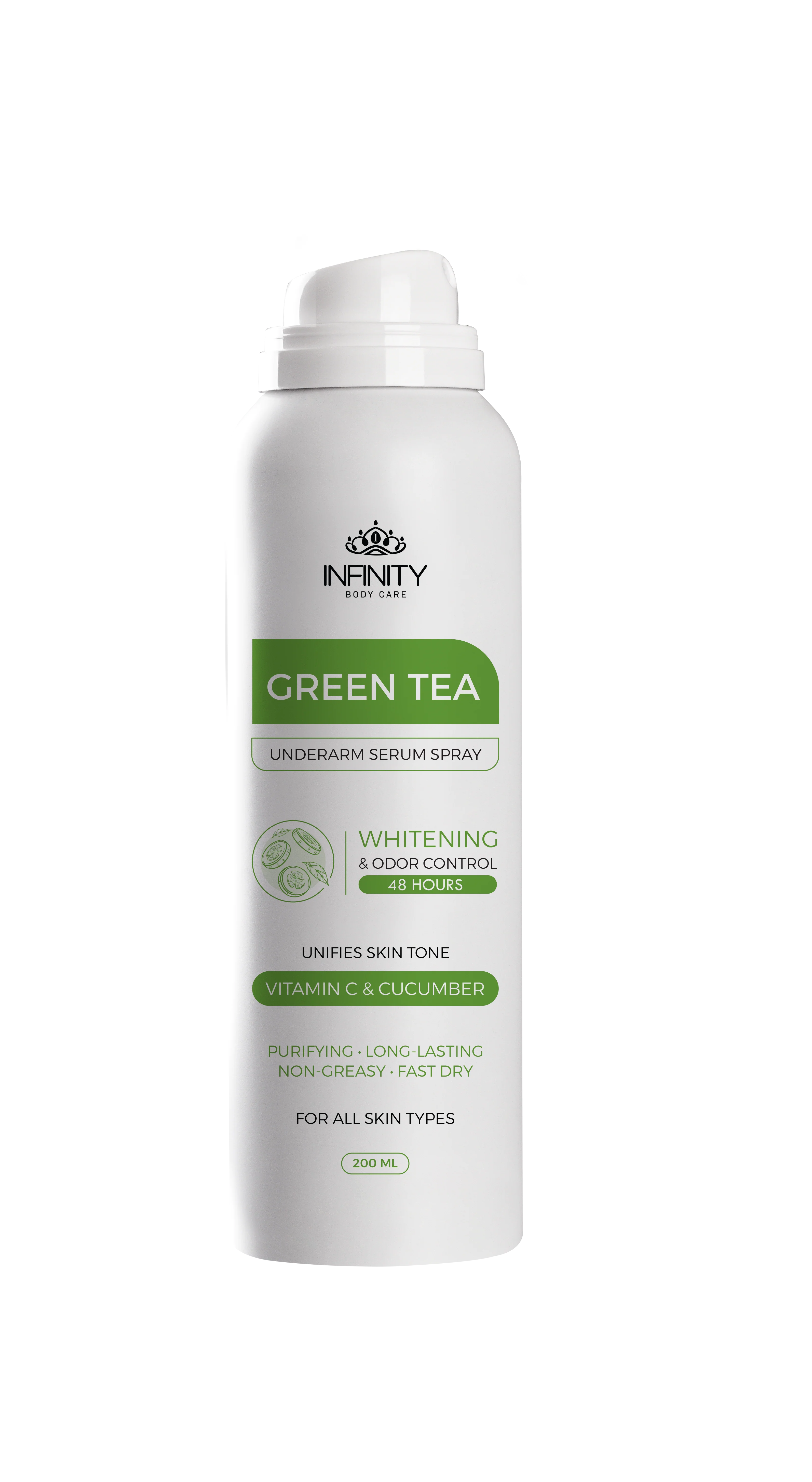 A refreshing underarm serum spray infused with Green Tea, Cucumber and Vit C to help purify and control odor while keeping underarms fresh, smooth, and protected for up to 48h.