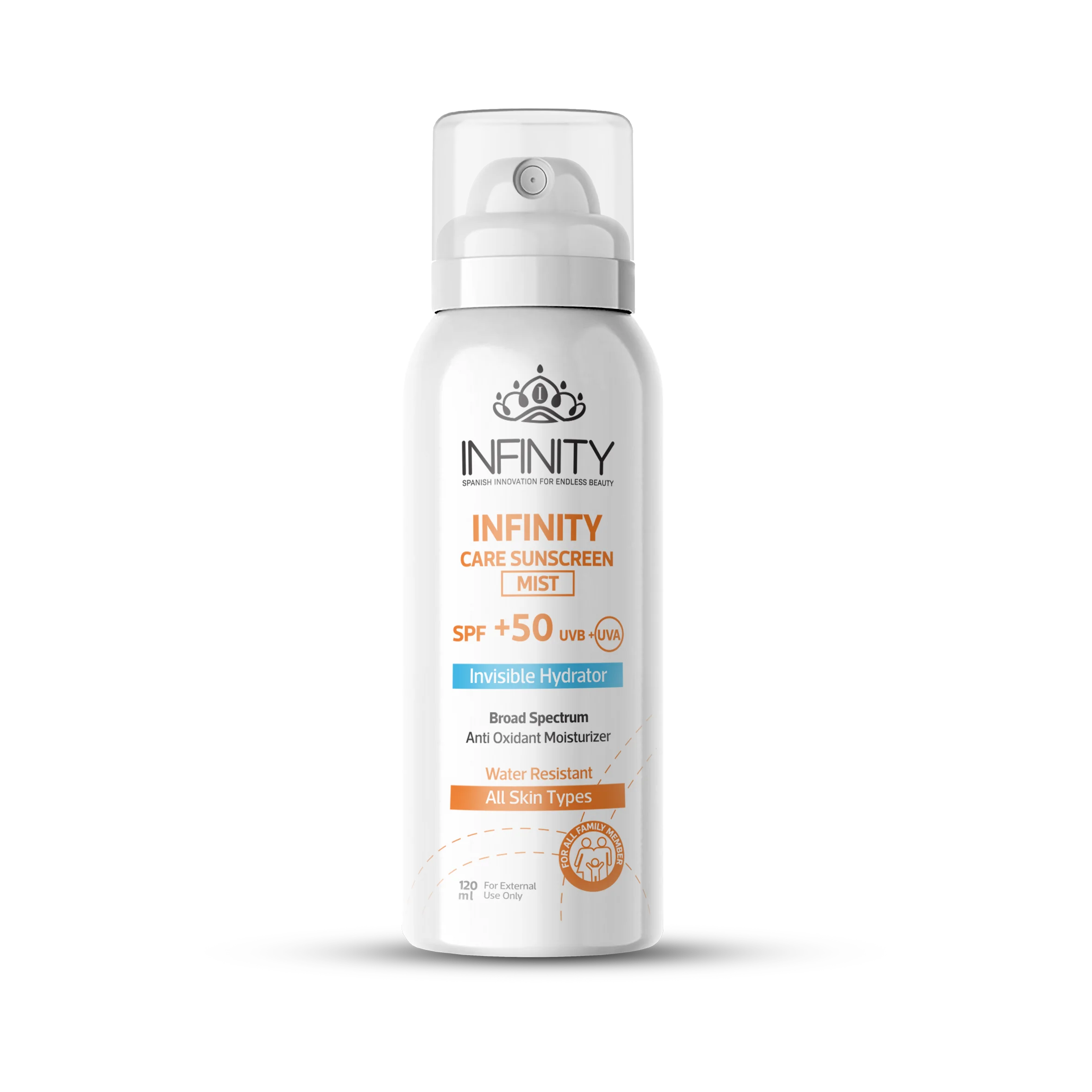 Infinity Care Sunscreen Spray SPF50+ is designed for the whole family members and for all skin types, with anti-oxidants and hydration properties that will protect your face and body against harmful sun rays, preventing sunburn, pigmentation, and harmful effects of UV radiations. Provides the highest sun protection. Infinity Care Sunscreen spray is perfect for reapplication of sunscreen throughout the day