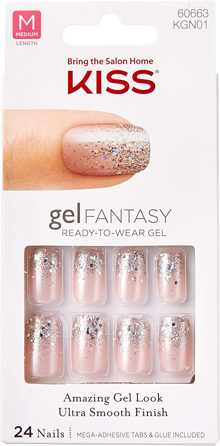• Details: 24 mega-adhesive tabs comes with Pink gel glue includes Manicure stick. With kiss gel fantasy nails fanciful you can sport a sparkling glitter manicure that stays shiny and bright with an ultra-smooth finish, without the hassle of glitter removal! And with two ways to wear, you can choose to glue them on or use the mega-adhesive tabs, either way they'll wear for up to a week.