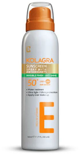 Kolagra sunscreen spray SPF 50+ protects your skin from harmful UV rays. Its broad-spectrum UVA and UVB filters leave your skin protected., Kolagra Sun Spray is suitable for all skin types, especially oily & combined skin, even the most sensitive ones. It is easy to apply evenly and is water-resistant.