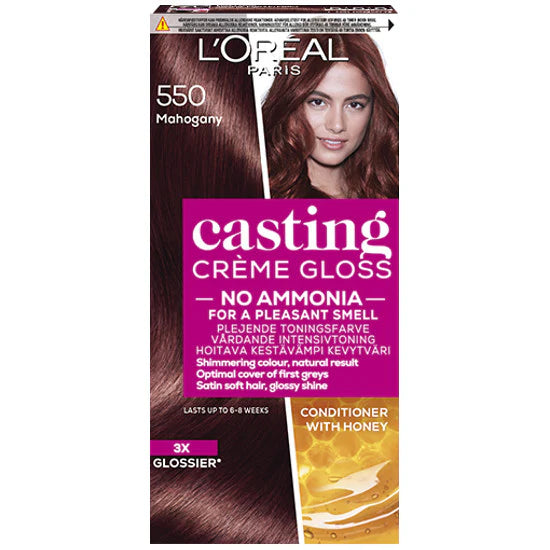 تمنحك صبغة شعر لوريال باريس كاستينغ كريم جلوس 550 ماهوجني لمعاناً براقاً ويغطي الشعر الرمادي. تمت تركيبه بمكونات خاصة لتوفير لون طبيعي المظهر. توفر صبغة الشعر هذه ترطيبًا مكثفًا أثناء التلوين. تغطي لون الشعر من لوريال باريس كاستينغ كريم جلوس الشعر الرمادي بنسبة تصل إلى 70٪ ويدوم حتى 28 غسلة. كما أن صبغة الشعر هذه دون أمونيا، لذا هي آمنة للاستخدام مع جميع أنواع البشرة تقريبًا.