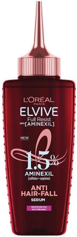 Reduce hair fall due to breakage by 92%¹ with the Elvive Full Resist [with Aminexil] Anti Hair-Fall Serum from L'Oréal Paris. A daily serum for strengthening hair. The ultra-potent scalp serum is formulated with 1.5% Aminexil, a patented molecule that is clinically proven to strengthen hair and minimise hair fall due to breakage. The formula is also boosted with Caffeine and Arginine. Scientifically designed and effective on hair with a tendency to fall due to breakage. For up to 2x less hair on your brush², complete the routine with the rest of the Full Resist [with Aminexil] Scalp and Hair Programme. The bottle is recyclable. ¹Instrumental test when used with shampoo & conditioner. ²Instrumental test.