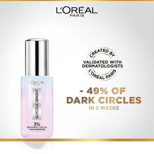 Discover the newest innovation from L'Oréal Paris, the Glycolic Bright Dark Circle Eye Serum. The concentration of 3% Glycolic Acid paired with Vitamin CG and Niacinamide gives both immediate and long-term brightening results to the undereye. Scientifically formulated for eye contour, fragrance-free & ophthalmologically tested.