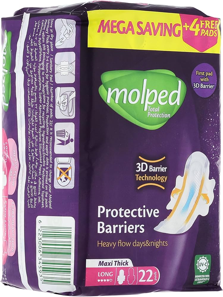 MOLPED's TOTAL ❤️ MAXI THICK LONG 22PADS +4 FREE PADS will keep you totally protected and stress-free! These 🙌 pads will keep you safe and sound so you can go about your day without any worries. Ready, set, 🏃♀️!