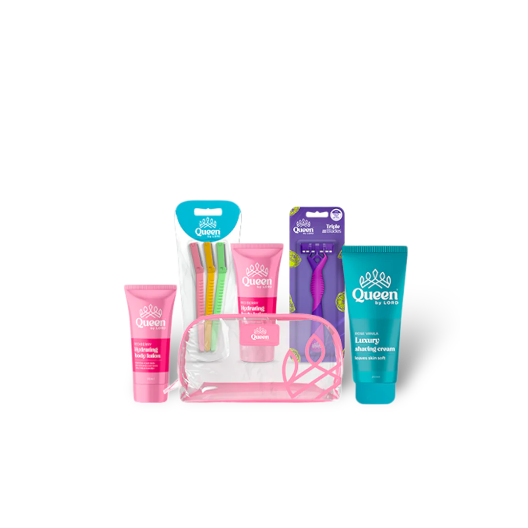 Be prepared for any occasion with the Always Ready Kit. This complete set includes Queen by Lord's high-quality triple-blade razor for a smooth shave, precise eyebrow razors for perfect grooming, and a luxurious rose vanilla shaving cream that leaves your skin feeling soft and refreshed. Enjoy the added bonus of two gentle baby lotions and keep everything organized in the signature Queen pouch. Perfect for daily use or travel, this kit ensures you’re always looking your best!
