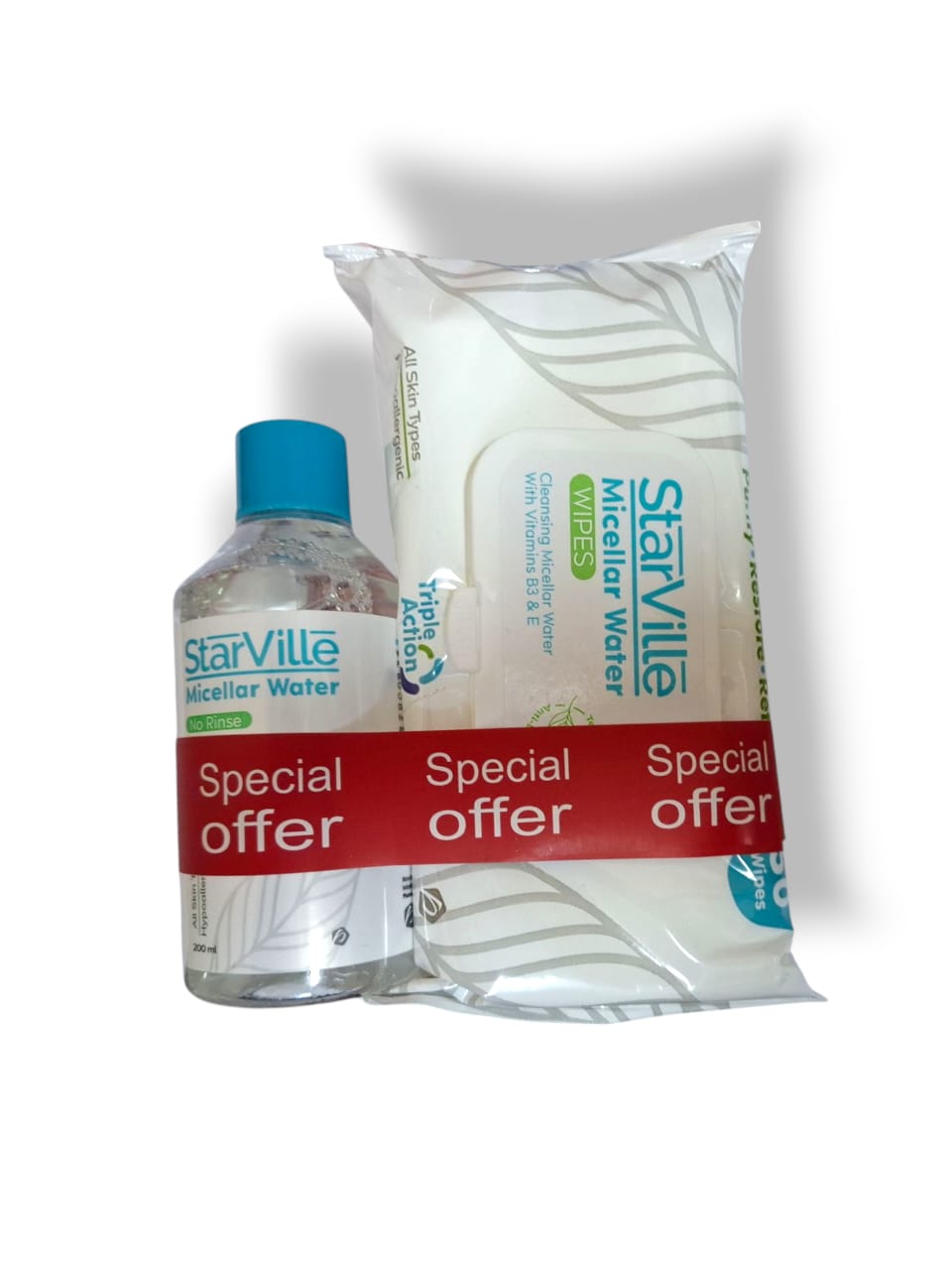 Introducing STARVILLE WIPES + MICELLAR 200ML OFFER - the perfect cleansing duo! These gentle and effective wipes are infused with micellar water, removing impurities and leaving skin feeling refreshed. Get a 200mL bottle of micellar water for free with purchase. Clinically proven to remove 99% of makeup, dirt and oil.