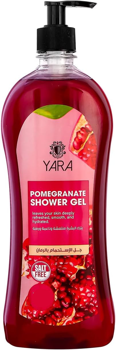 شاور جل بالرمان من يارا غني بالفيتامينات ومضادات الأكسدة، يرطب ويجدد بشرتك ويتركها ناعمة ونضرة ويُوفر الحماية لبشرتك من عوامل الإجهاد البيئي. يعمل على إزالة الجلد الميت ويجعل البشرة أكثر نعومة وأشراقًا. كما يوفر فوائد العلاج بالروائح العطرية المحتملة. يأتي في زجاجة سعة 1 لتر ولون أحمر.
